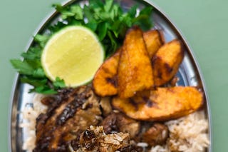Jerk Lion’s Mane with Rice & Gungo Peas + Fried Plantain